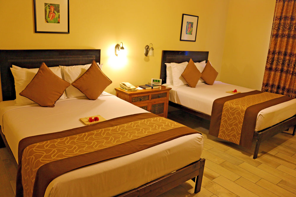 The two queen-size beds and Balinese furnishings give this room a feeling of subtle elegance complemented by earthy tones that blend with the natural beauty of the hotel’s surroundings.